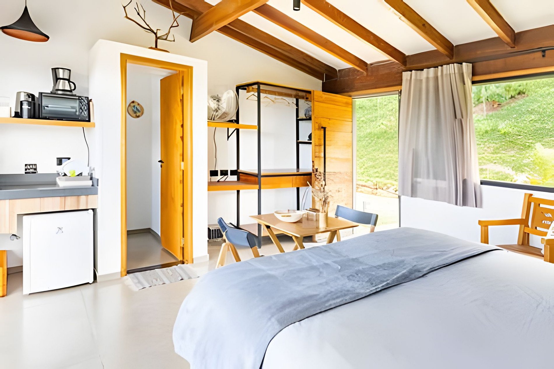 Suíte de 30m2 com cama king size (opção de duas camas de solteiro), mini copa equipada com frigobar, forninho elétrico, cafeteira e chaleira elétricas e utensílios básicos para o preparo de um café da manhã ou lanche rápido (pratos, talheres, copos e xícaras) Chuveiro e torneiras com aquecimento a gás. Lareira ecológica a base de etanol. Ótimo sinal 4G, além de wi-fi. A 15 minutos do centro de São Bento do Sapucaí, com 2km de estrada de terra íngremes. Época de chuvas, acesso somente em 4x4.