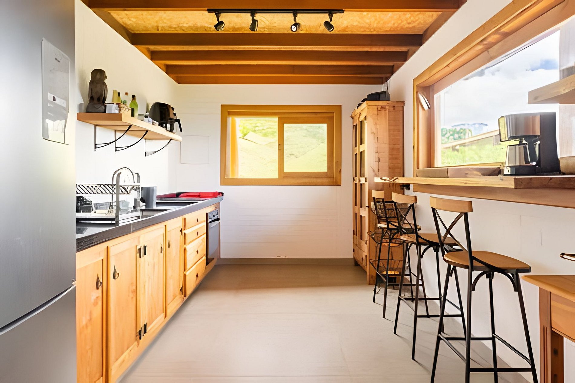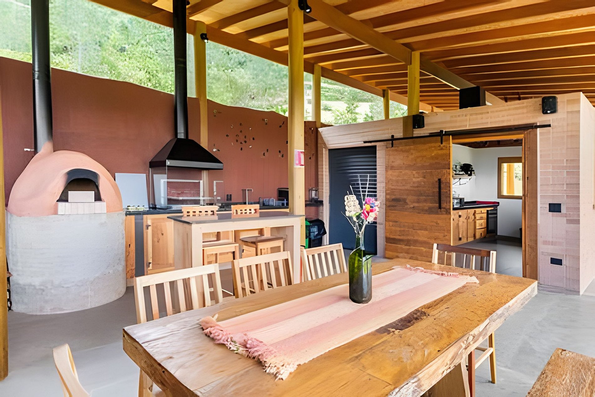 A Gorjeios oferece uma cozinha de uso compartilhado, equipada com fogão cooktop, geladeira, forno, liquidificador, air fryer, sanduicheira e todos os utensílios para cozinhar, neste espaço comum também há um forno de pizza e churrasqueira.